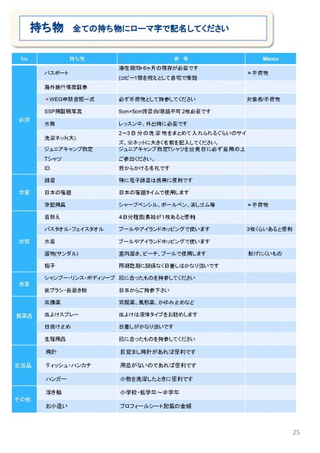 ・海外旅行保険(加入必須) ・個人のおこづかい ・WEG申請費用および現地WEG認証代(15歳未満単独入国の場合) |