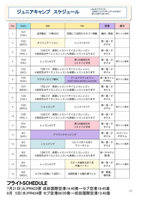1日目:成田空港第2ターミナル集合 → 出国手続き → セブ到着 → ウェルカムセレモニー・夕食・部屋割り・ガーディアンティーチャーとの顔合わせ。