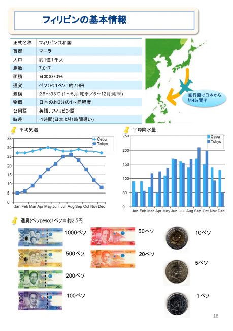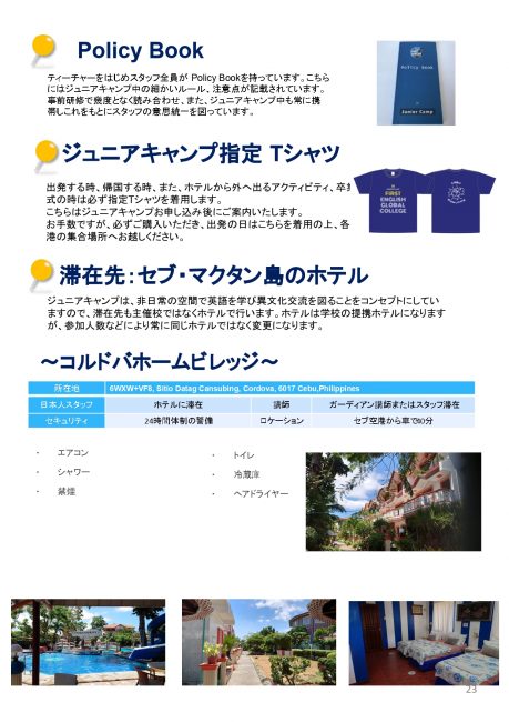| 旅行代金に含まれるもの | 登録料、授業料、食事(3食)、宿泊費、SSP申請費用、教材費、洗濯代、部屋掃除代、修了証書、週末アクティビティ費、付添いTeacher派遣代、空港の往復送迎費、引率者同行サービス代、専用Tシャツ代、資材費、成田~セブ往復航空券代金(燃油サーチャージ等は発券時に変動の可能性あり)。 |