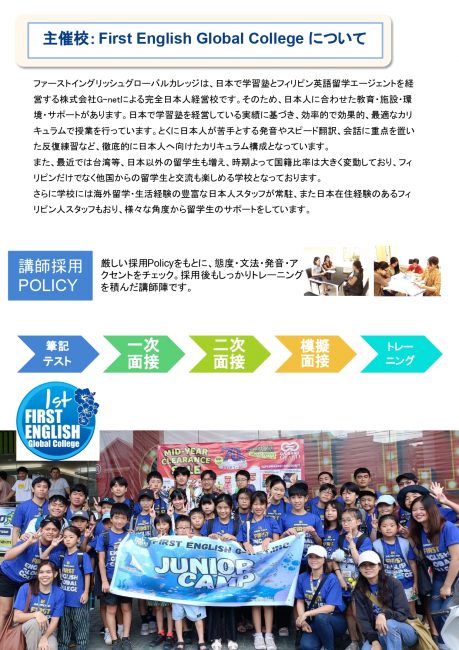 First English Global Collegeのセブ島ジュニアキャンプへのお申込み・お問い合わせは、ファーストイングリッシュで承っています。