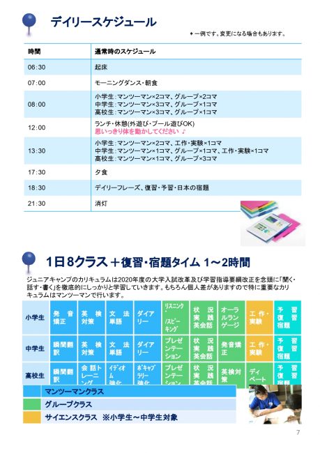 ジュニアキャンプでは、マンツーマンレッスンと少人数制グループレッスン、さらに科学の実験などのアクティビティクラスを組み合わせて、1日合計8時間の英語レッスンを行います。