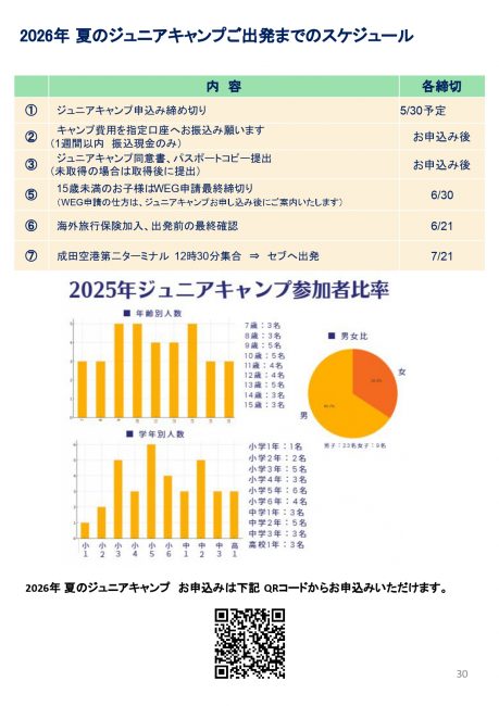 申込フォーム送信後、キャンプ費用のお振り込み、同意書・パスポートコピーのご提出、15歳未満の方のWEG申請、海外旅行保険への加入など、パンフレットに記載のスケジュールに沿ってお手続きいただきます。