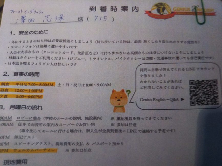 ※GENIUSの新入生は、毎週日曜日の朝10時~23時59分までの間にセブ空港に到着予定のフライトでお越しください。