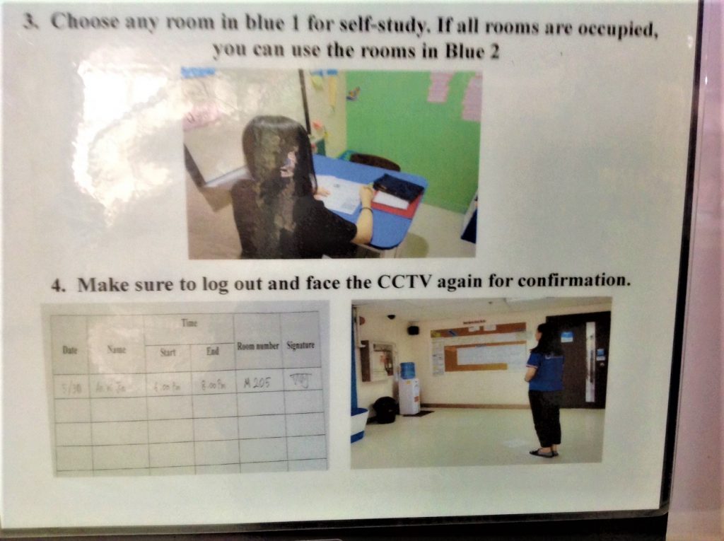 自習を開始する際にCCTV(カメラ)に自分の姿を映すことで証明するようになっています。